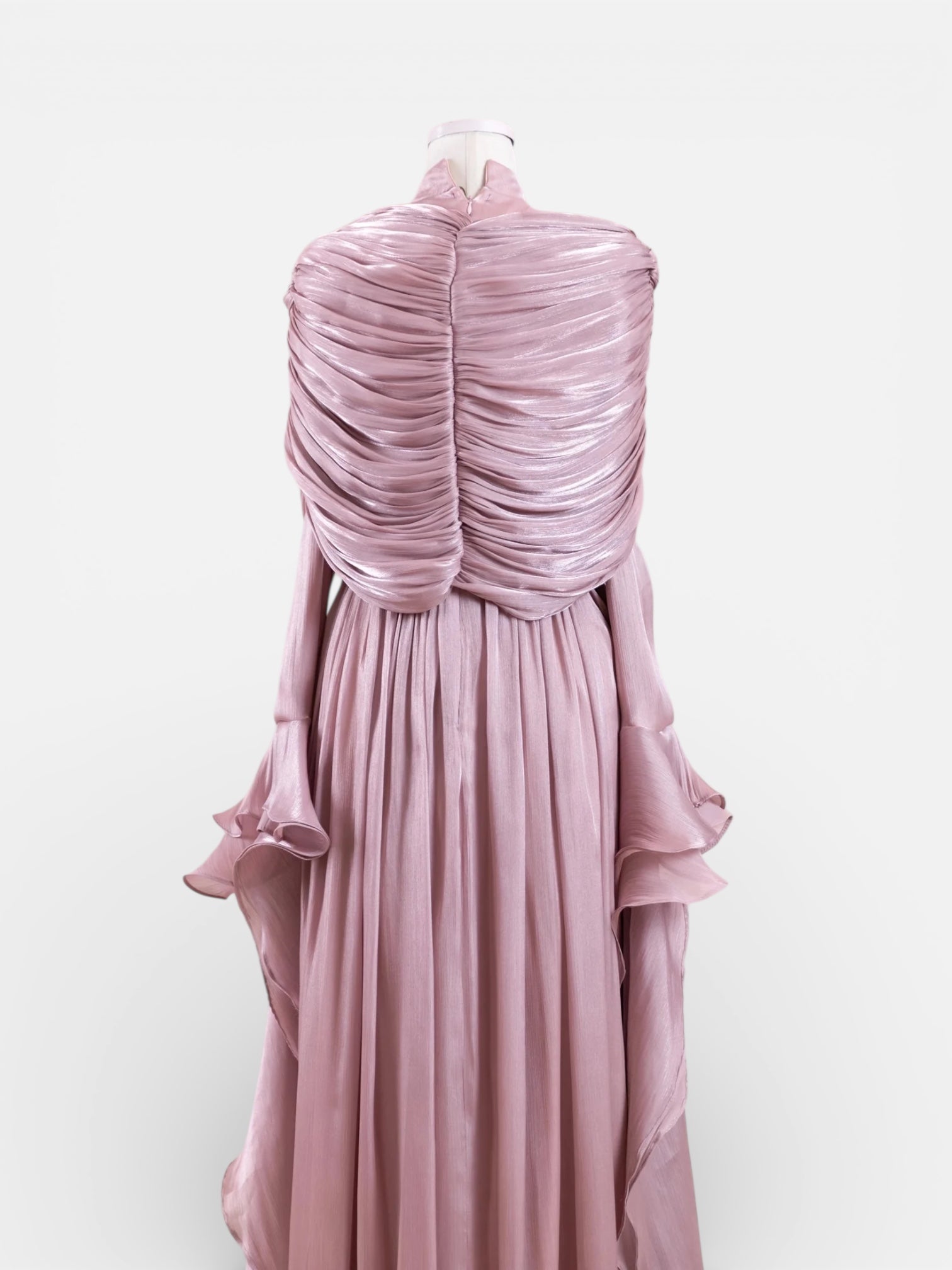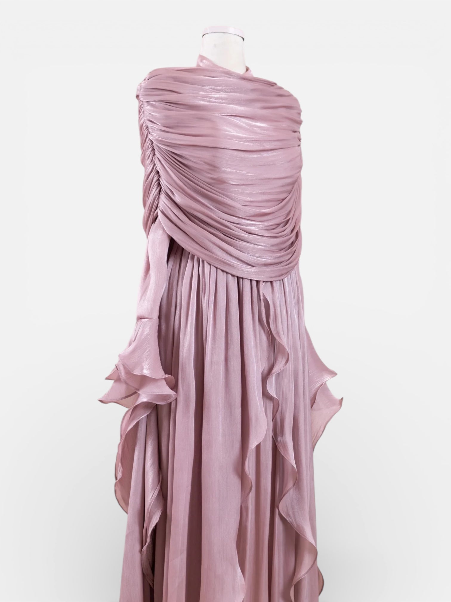 Elegant gown with a graceful, flowing silhouette. A detachable shawl drapes across the chest and shoulders, creating a softly sculpted look, with airy panels cascading along the arms. The waist is subtly defined, flowing into a full-length pleated skirt made of lightweight, layered fabric. Cascading ruffles enhance movement and give the dress a romantic, ethereal finish.