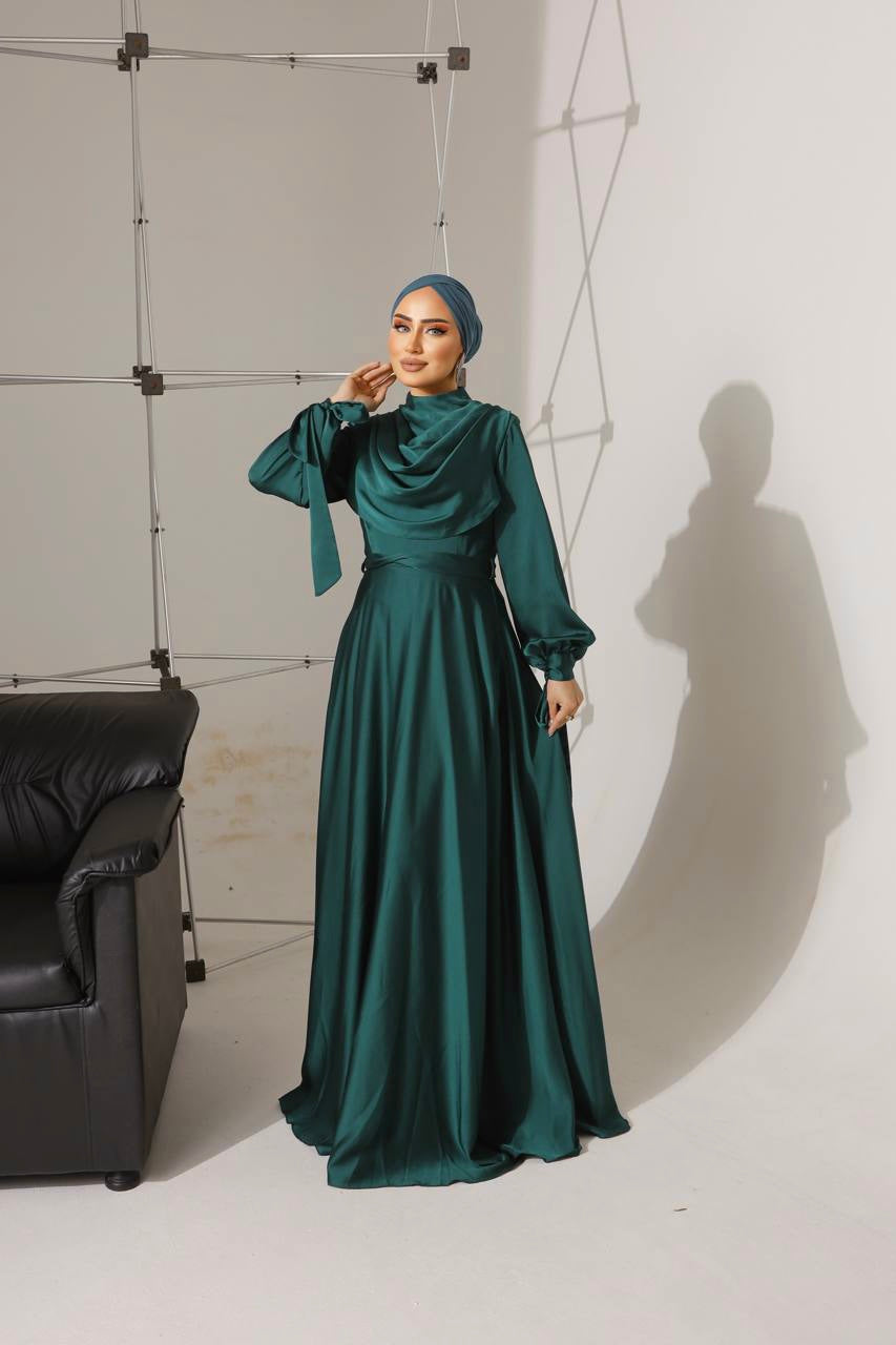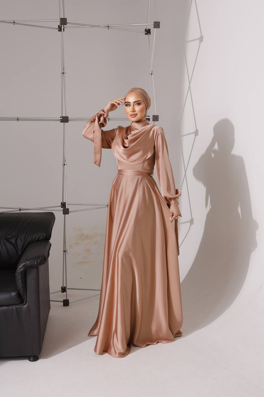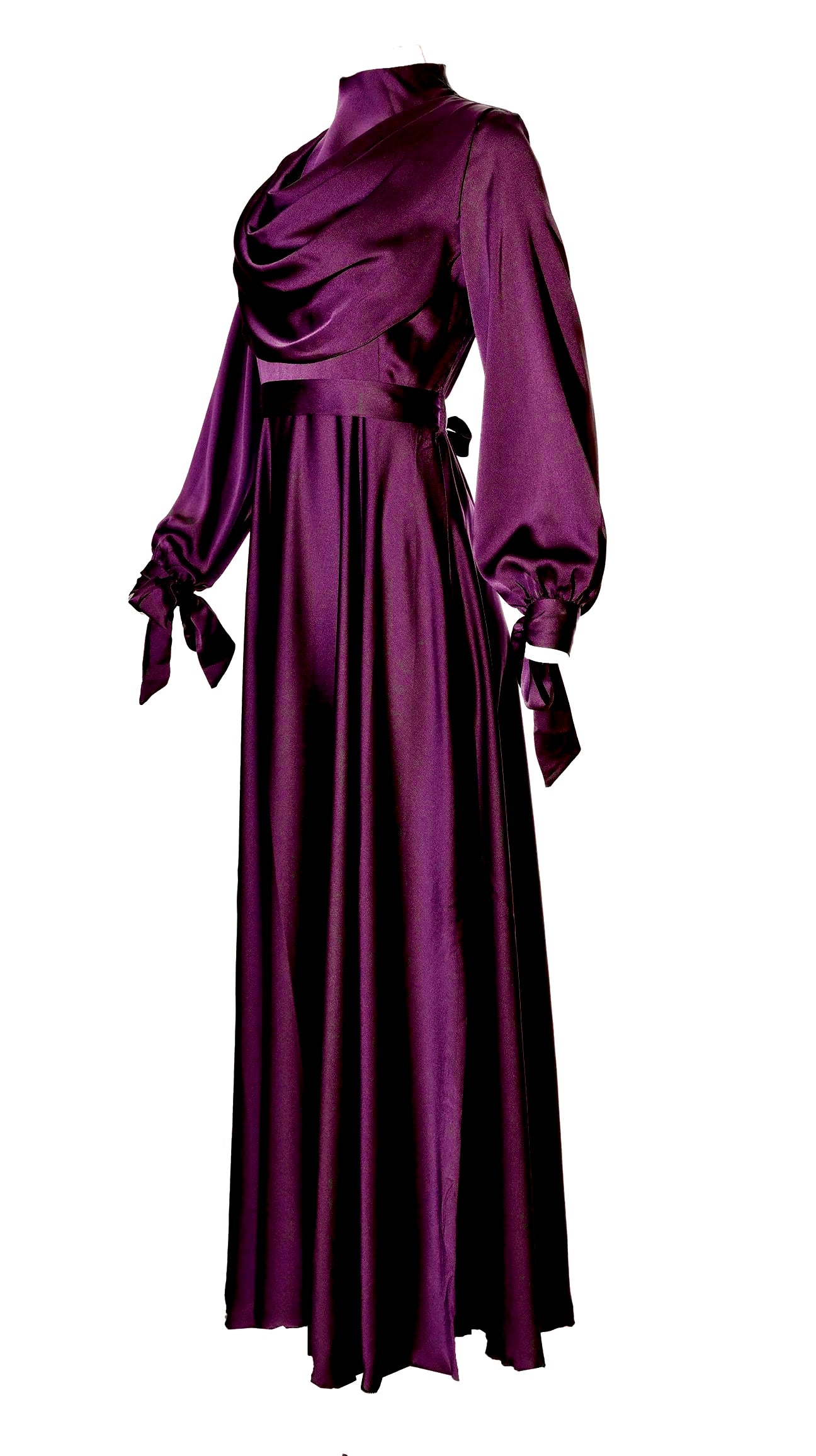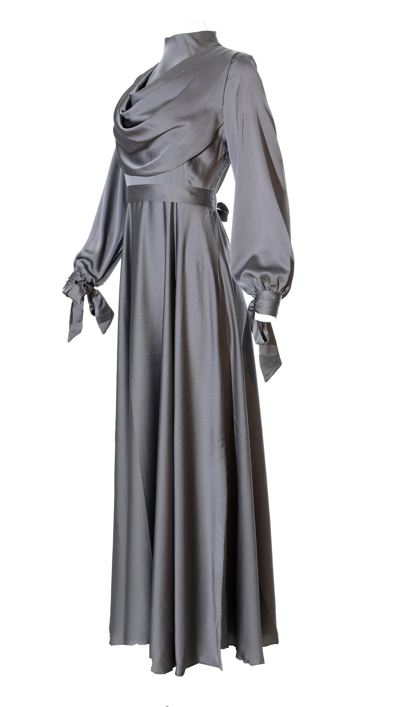ANAYA Satin dress is shaped with a high neck with a draped cowl neck inspired bodice and long sleeves that ties at the cuffs.