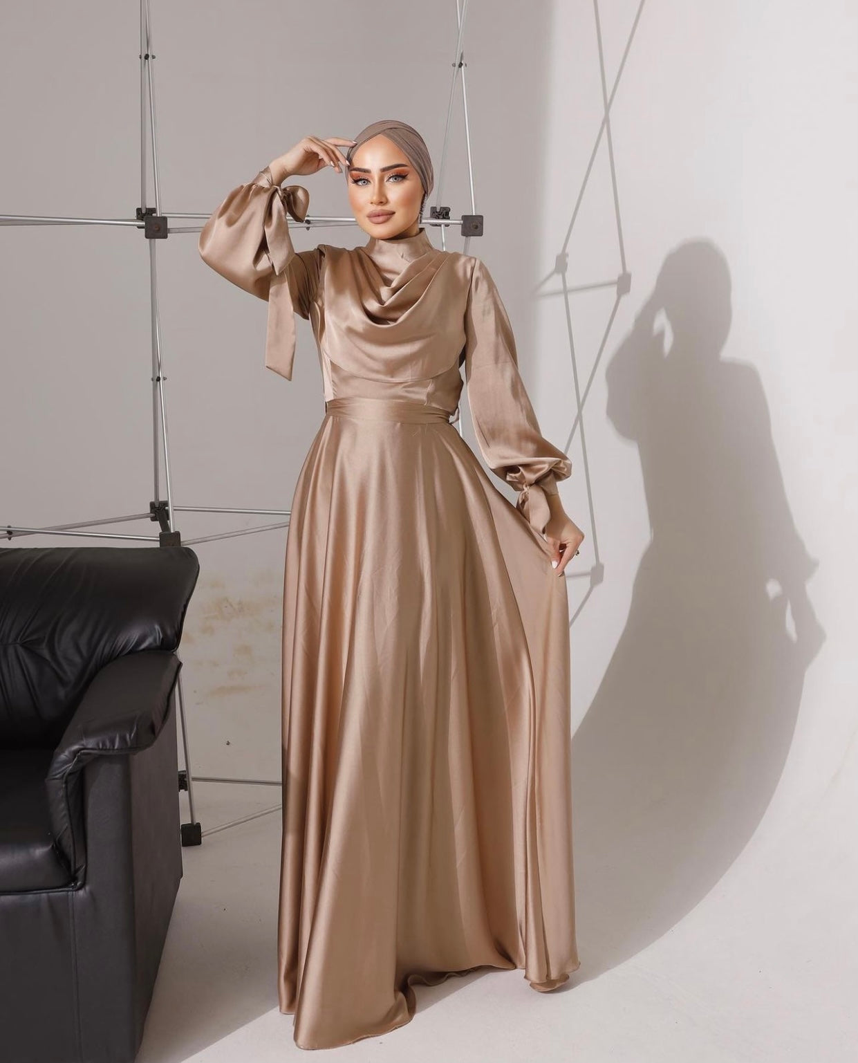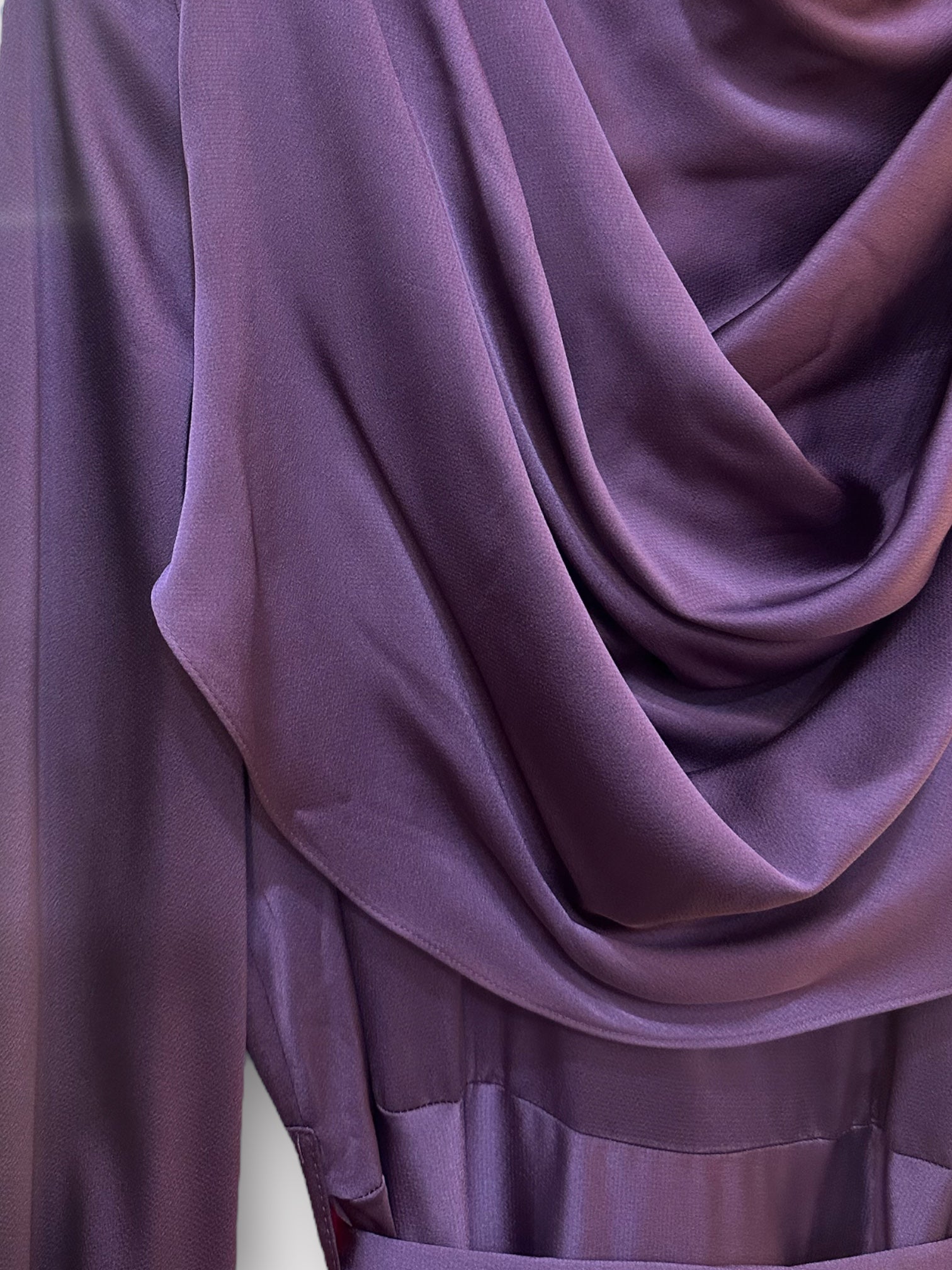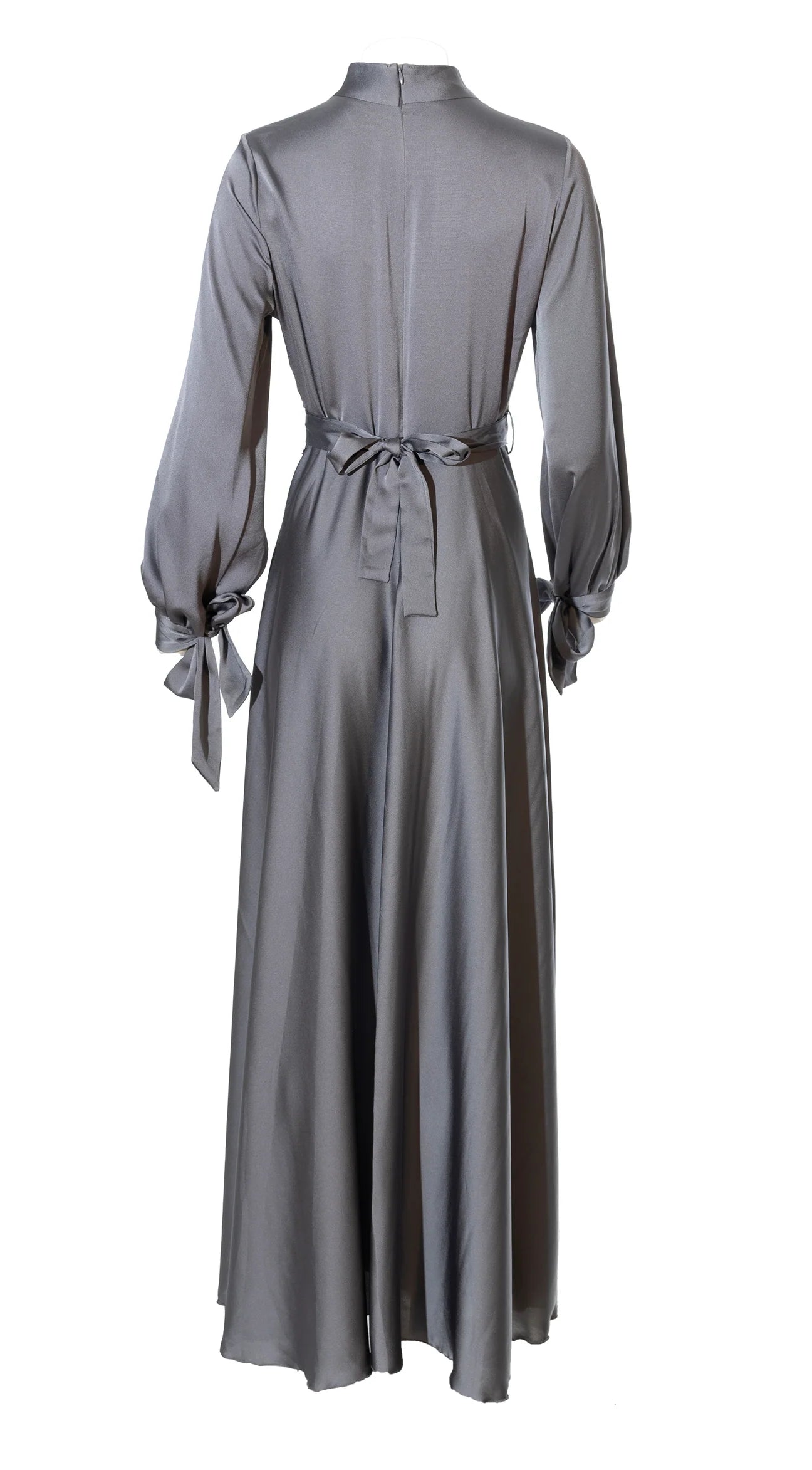ANAYA Satin dress is shaped with a high neck with a draped cowl neck inspired bodice and long sleeves that ties at the cuffs.