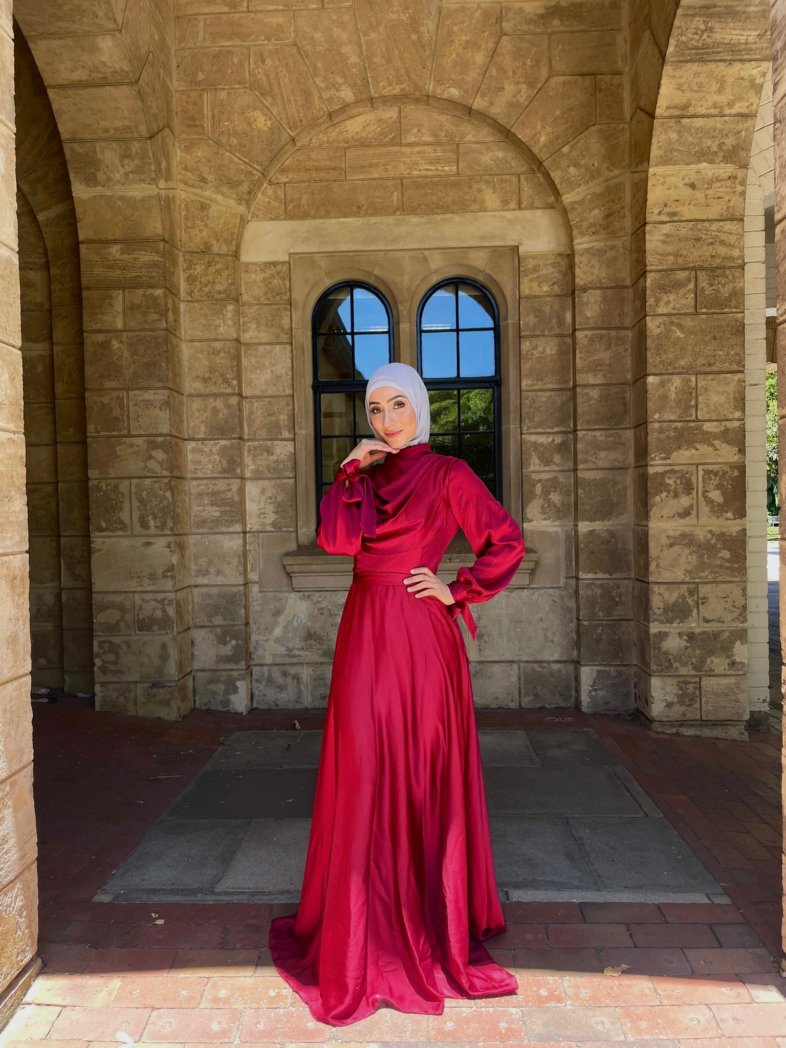 ANAYA Satin dress is shaped with a high neck with a draped cowl neck inspired bodice and long sleeves that ties at the cuffs.