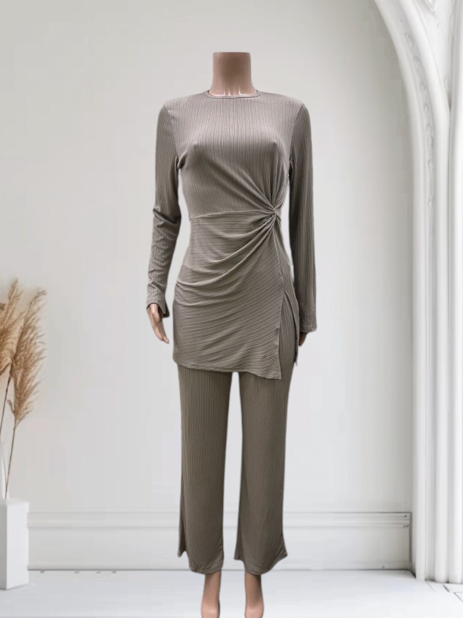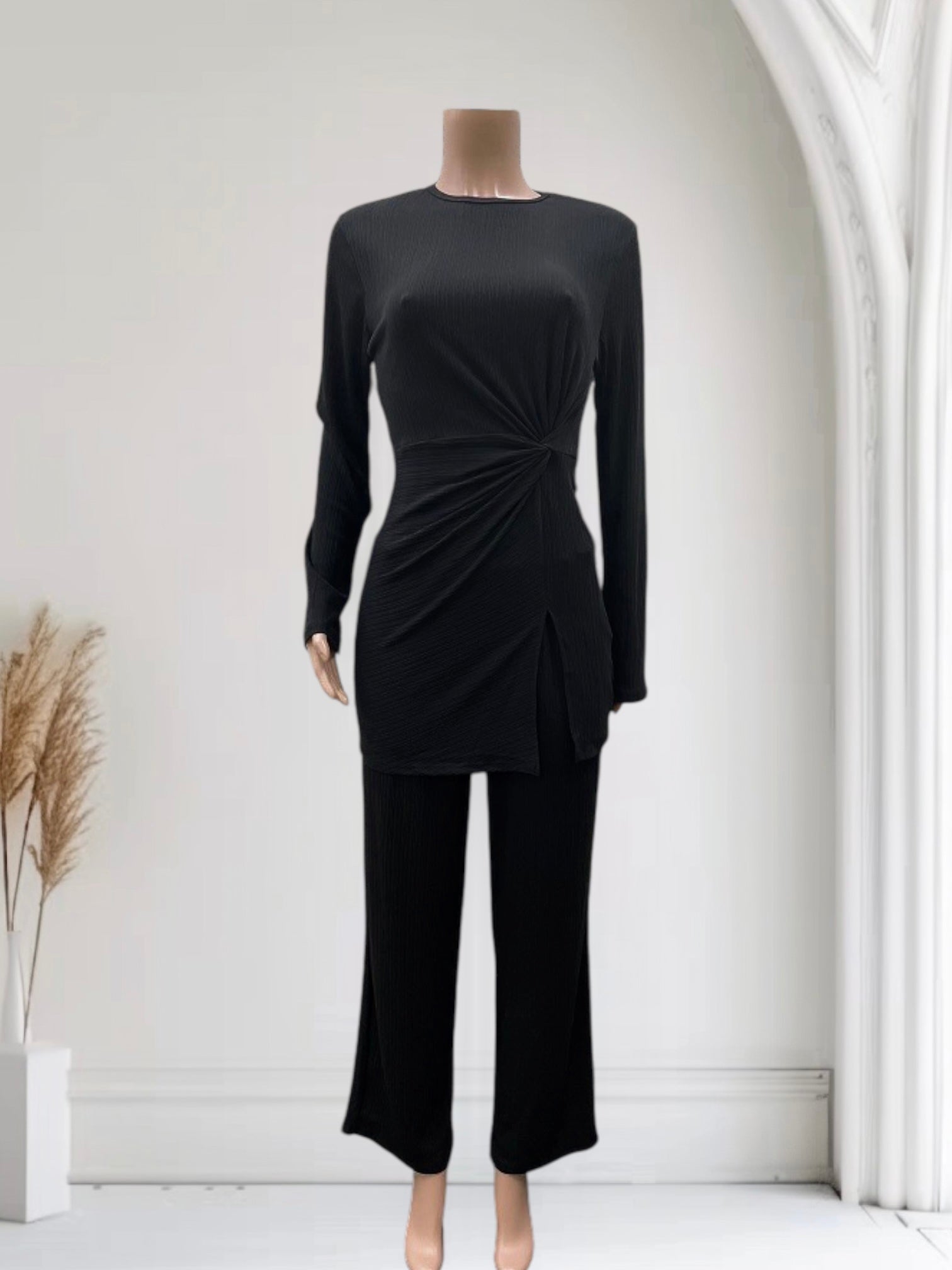 - Pants are full length with elastic waistline