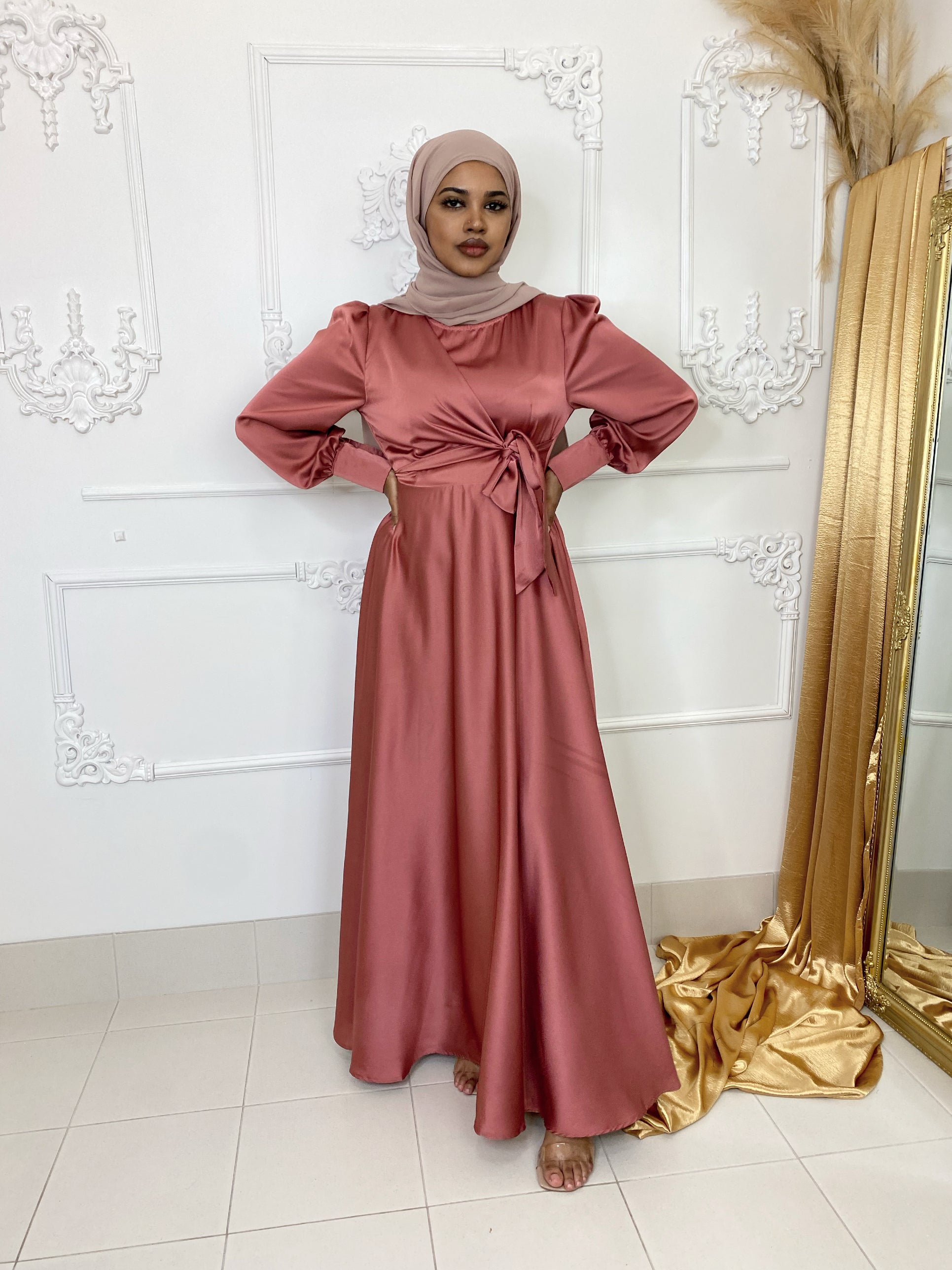 This beautiful evening dress is made from flowy satin fabric with elastic at the back, Long sleeve with button cuffs. Has a stunning extra detail that you tie cross waist which gives such a flattering Look. Model is size 10 wearing size 8 Height(167cm)