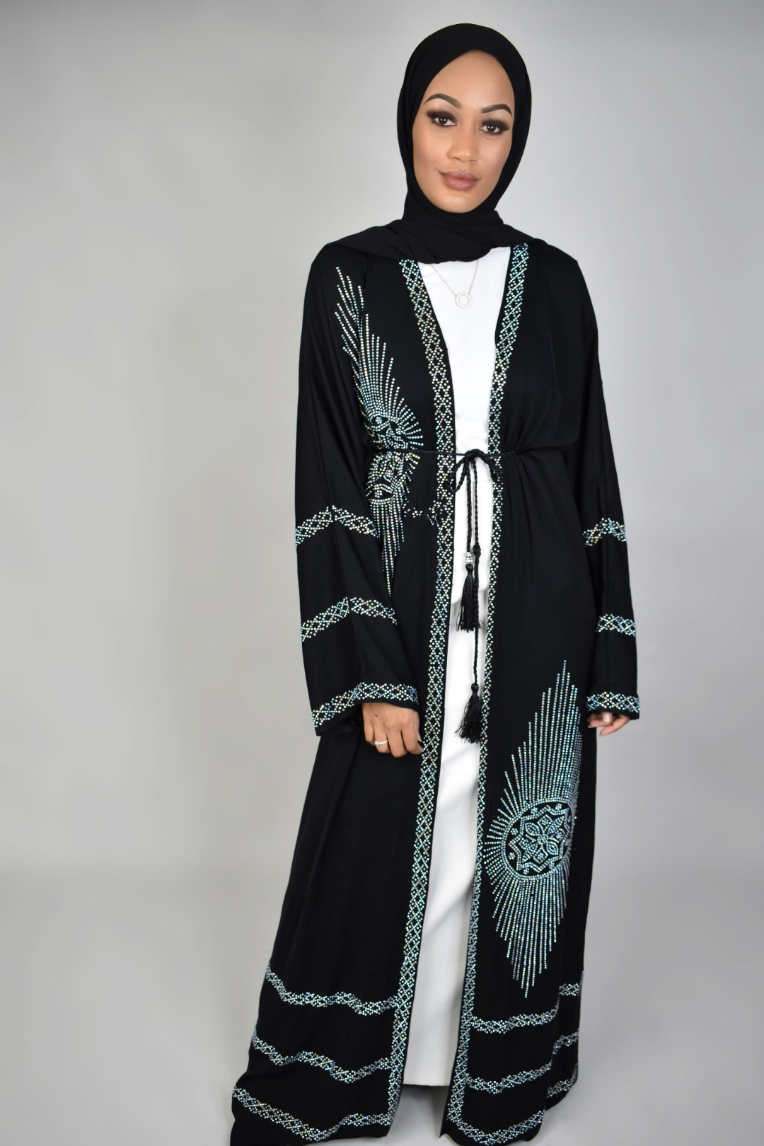 Abaya's are generally a loose-fitting and full length garment. All our abayas come in a freesize fitting with a variety of lengths. Please measure using the size chart below.